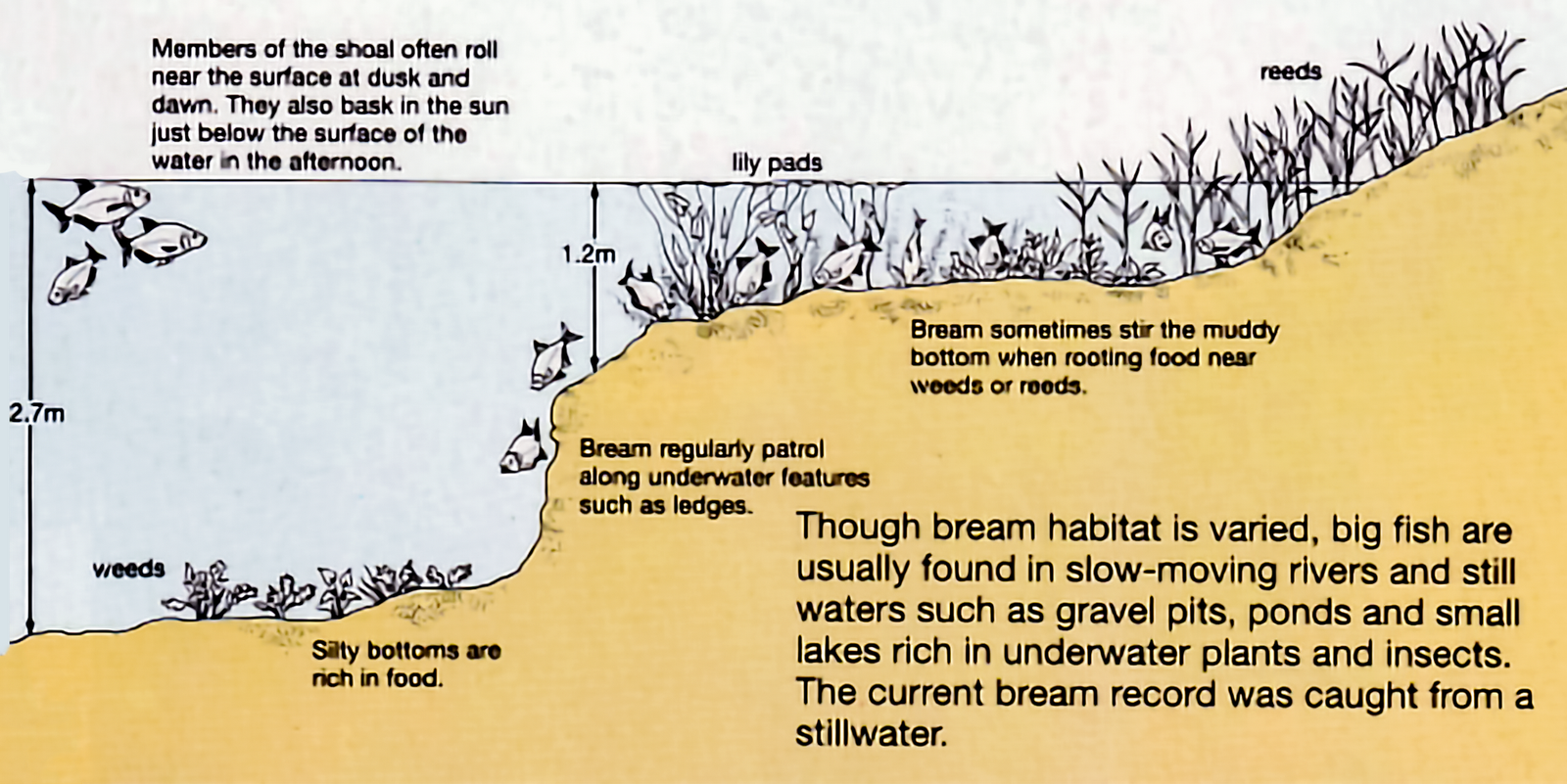 Bream are thought of as still-water fish. They are attracted to shallow, reedy bays to feed and bask in the sun. They are, however, more adaptable than many anglers think - they can thrive in moderate to fast-flowing rivers, sheltering just outside the main current under tree roots, in deep pools or near undercut banks.
