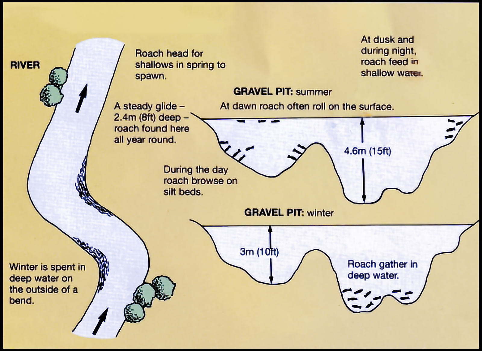 In reservoirs, gravel pits and chalk streams which are nutrient rich and where Pike, Perch and Trout tend to reduce numbers, the Roach are far fewer but larger.