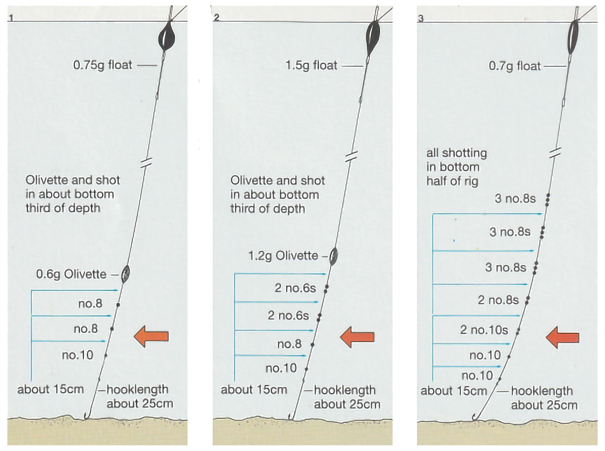 Sometimes you can catch 'on the drop'; at other times the fish want the Bait near the bottom. To cover both eventualities, set up two Rigs: one with an Olivette (accounting for around 75% of the total loading) plus a few Droppers; the other with Shot or Styls strung out 'shirt-button' fashion.