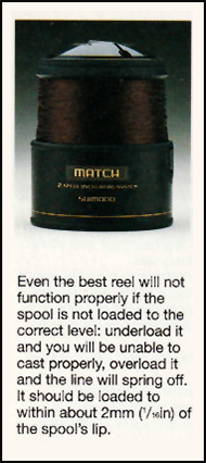 Most reels have Quick-release Spools so you can remove them by simply pressing a button. Reels which take spools of different line capacities are useful. It means that you can keep a spool of different breaking strain line for each type of fishing and need fill each spool with only 100m (109yd), say, of line. So, for example, in early summer, Tench might be your quarry - and a spool taking 100m (109yd) of 4lb (1.8kg) line would be ideal. But, in late autumn you may be after roach and need a shallower spool taking 100m (109yd) of 2lb (0.9kg) line.