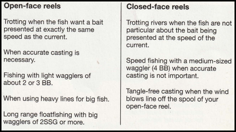With an Open-face Reel the line peels effortlessly off the wider spool. This means that you can cast much farther, with less effort, more accurately than with a Closed-face Reel. This same smooth supply of line also makes the Open-face Reel a tempting choice for trotting on rivers. In this situation an Open-face Reel is better because pressure on the spool from big fish tends to make the line bed-in with Closed-face reels.